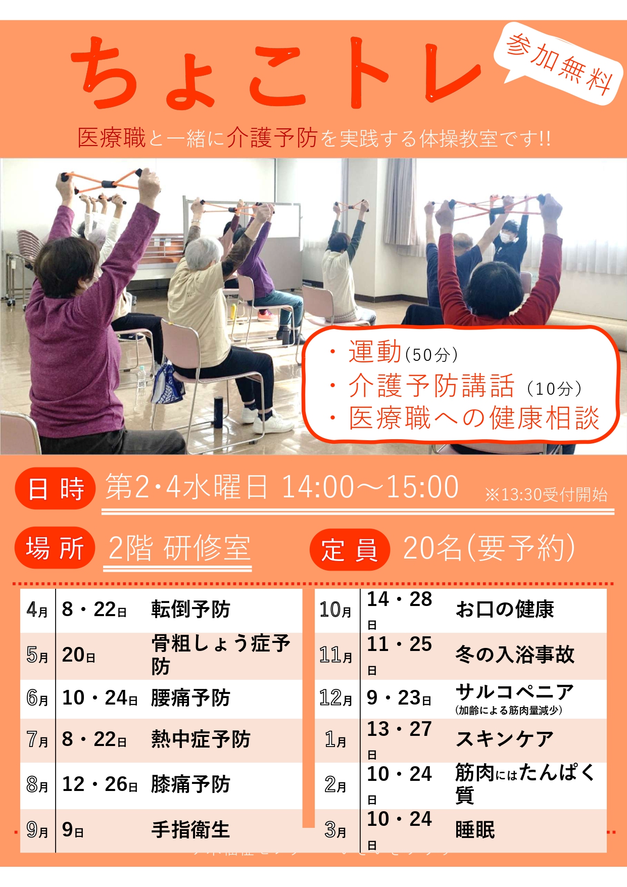ちょこっとの手頃なトレーニングを行う体操教室です。医療専門職による健康相談も受け付けています。